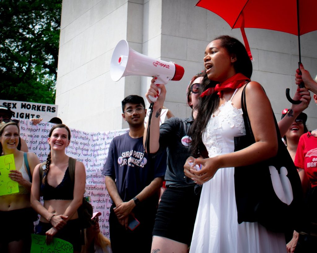 Some of the signs held by activists read, “STIGMA KILLS,” “MY BODY, NOT YOUR CHOICE,” and “SEX WORK ≠ TRAFFICKING”, Jezebel reported.